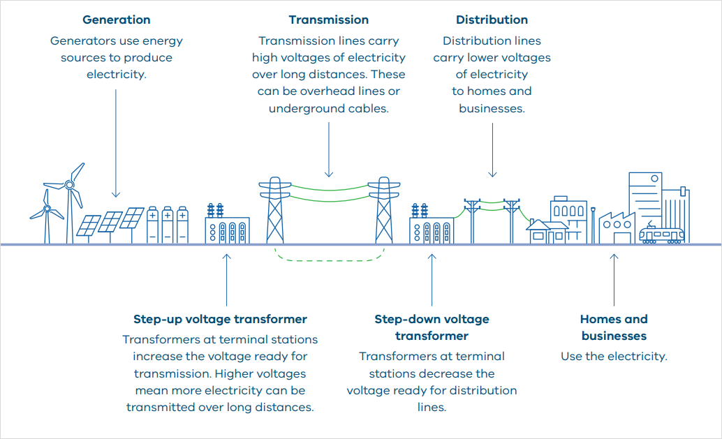 The electricity is then converted to a lower voltage at terminal stations at the end of the transmission network. From here electricity is transported to homes and businesses across the state by the distribution network. These are the poles and wires that we see along our streets.